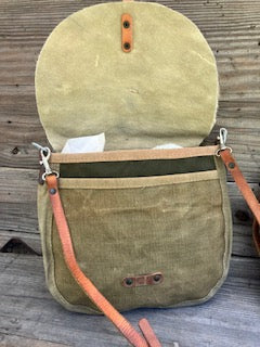 vintage military canvas mixed with blonde hair hide makes this cool small messenger bag