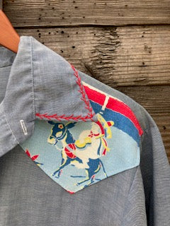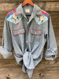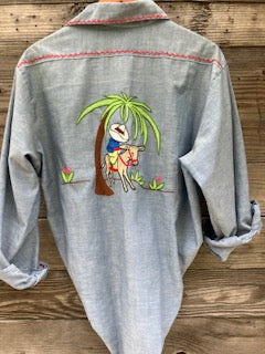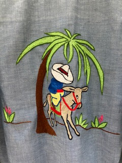 vintage reworked chambray shirt with palm , burro and vintage mexican textiles.